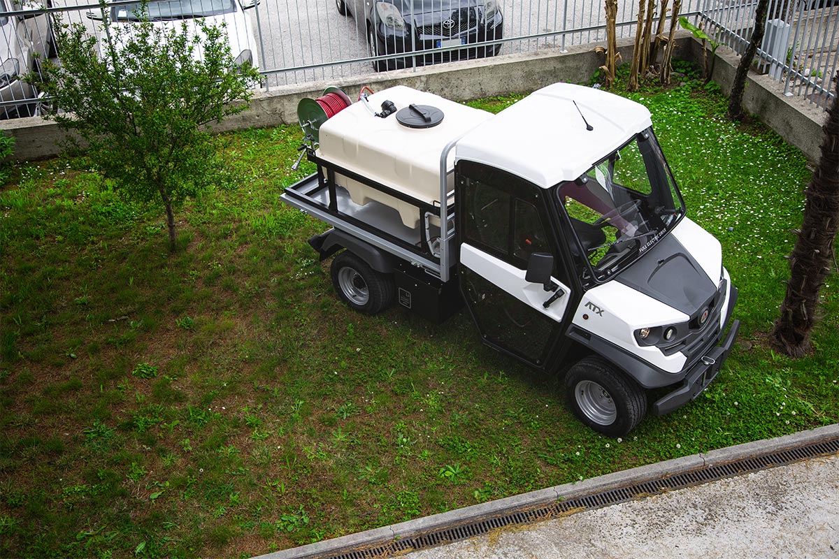 Alke' electric vehicles can also be equipped with tank and sprayer, a set-up used primarily by groundskeepers for the maintenance of large green areas. Also in this case, as with the pressure washer module, the tank is made from fibreglass and has a capacity of 600 litres. 50 metre hose with nozzle and electric pump with a capacity of maximum 20 l/min and maximum pressure 13 Bar. These silent and non-polluting vehicles provide valuable help in carrying out all spraying and maintenance activities of large green areas, like for example public gardens, parks, sports facilities, and wooded areas, as well as vegetable gardens and orchards.